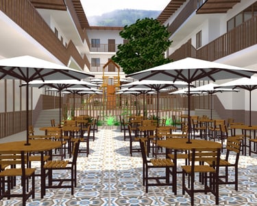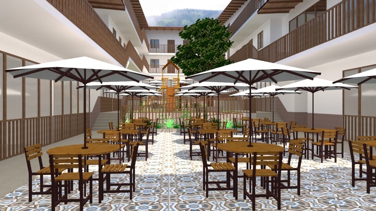 El diseño del Mall es moderno y ligero. Interactuando en el mismo espacio un ambiente gastronómico y residencial. Habrá variedad de restaurantes, bares y la posibilidad de hospedarse por largos o cortos periodos de tiempo.